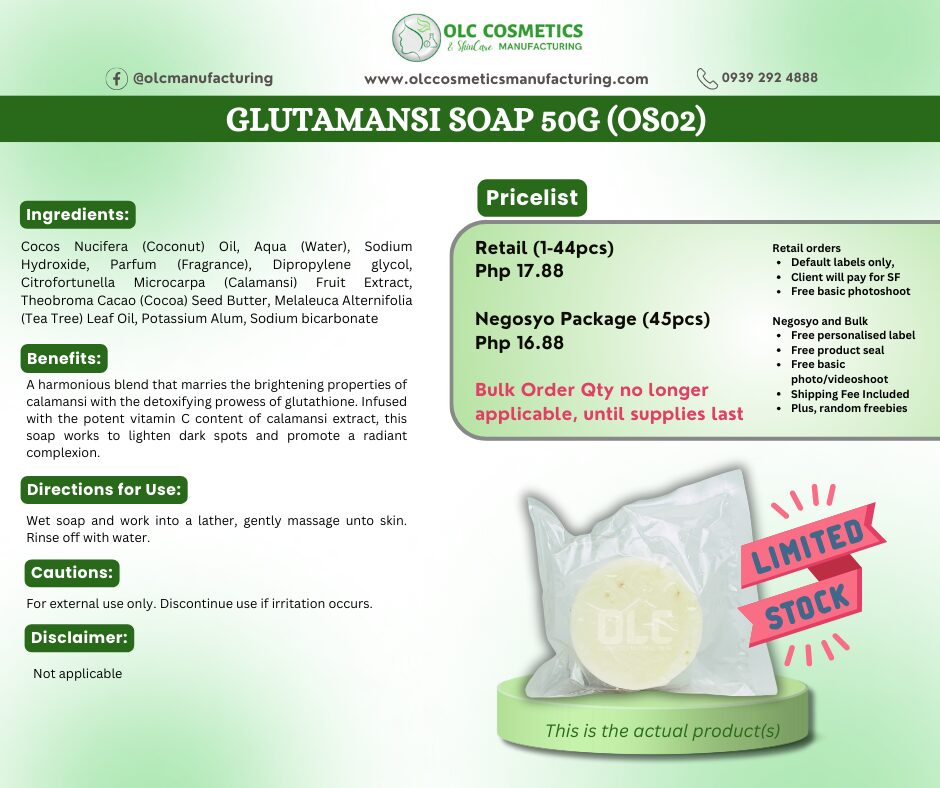 Benefits: Enriched with the natural essence of citronella, known for its refreshing and antiseptic and insect repellent properties, this soap offers a revitalizing cleanse that leaves you feeling rejuvenated. Also, infused with the brightening power of calamansi extract.