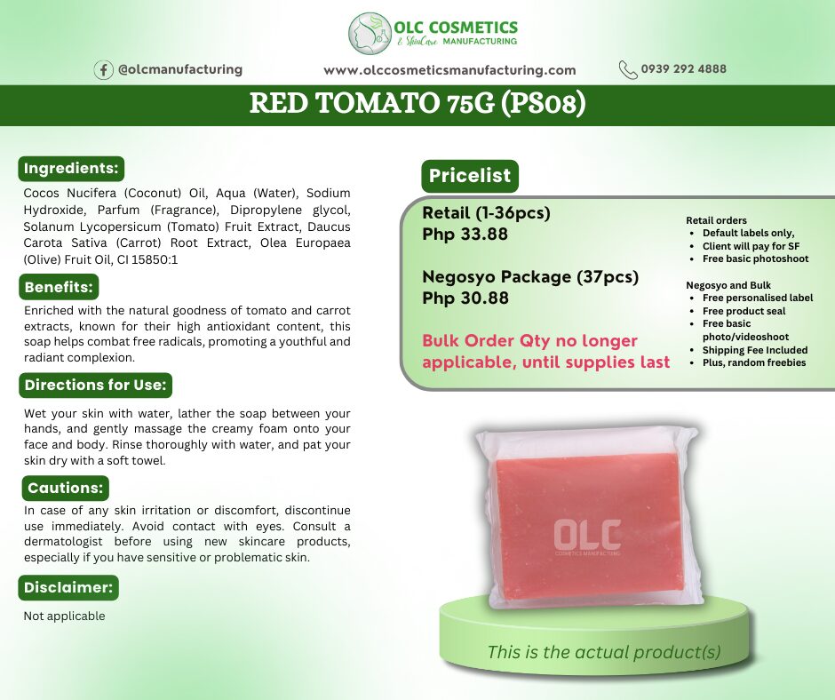 Ingredients: Cocos Nucifera (Coconut) Oil, Aqua (Water), Sodium Hydroxide, Parfum (Fragrance), Dipropylene glycol, Vitis Vinifera (Grape) Seed Oil, Solanum Lycopersicum (Tomato) Fruit Extract, Kojic acid dipalmitate, CI 15985