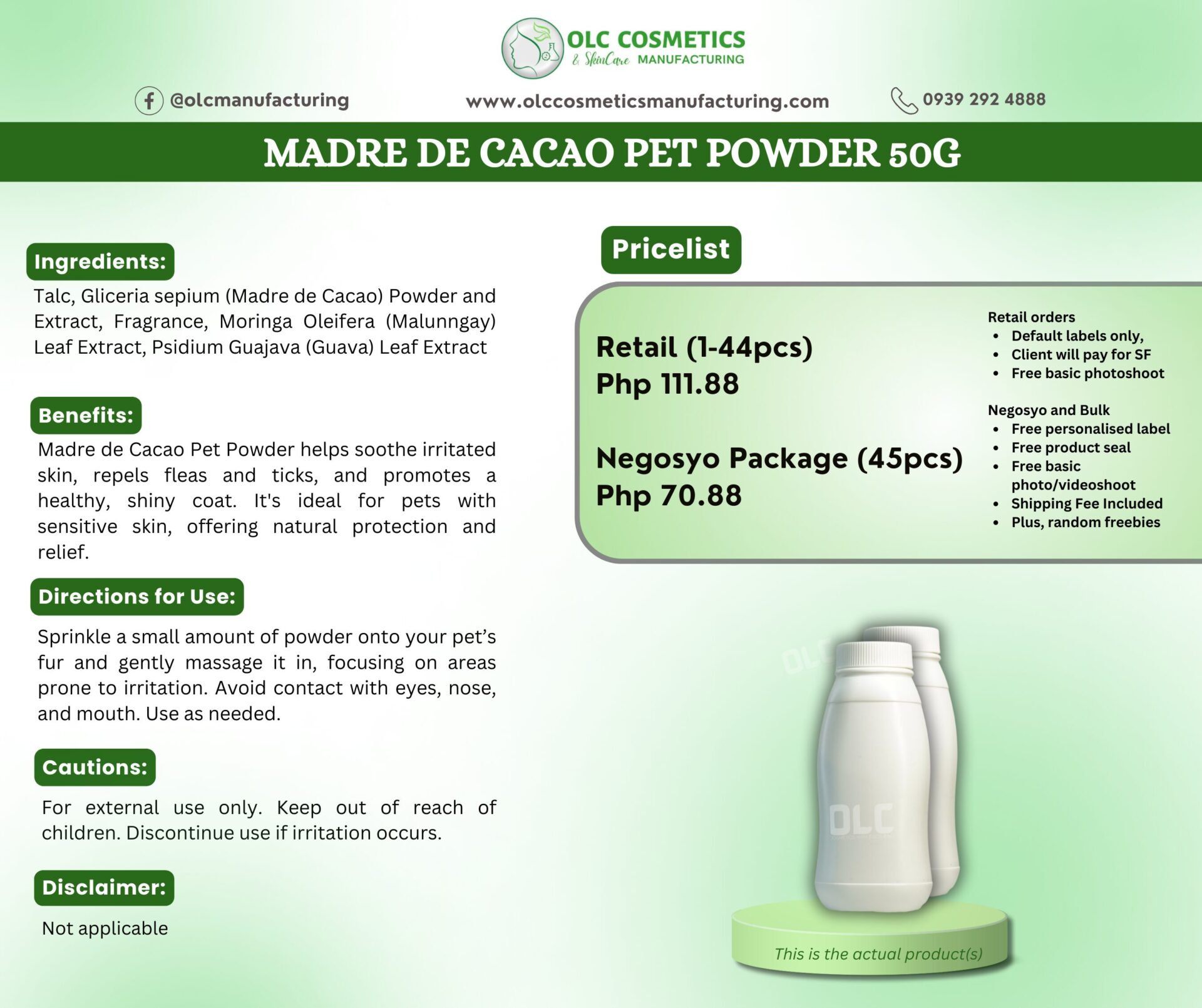 Cautions: For external use only. Avoid contact with your pet’s eyes, mouth, and nose. In case of contact, rinse immediately with plenty of water. Discontinue use if irritation occurs. Keep out of reach of children. Store in a cool, dry place away from direct sunlight.