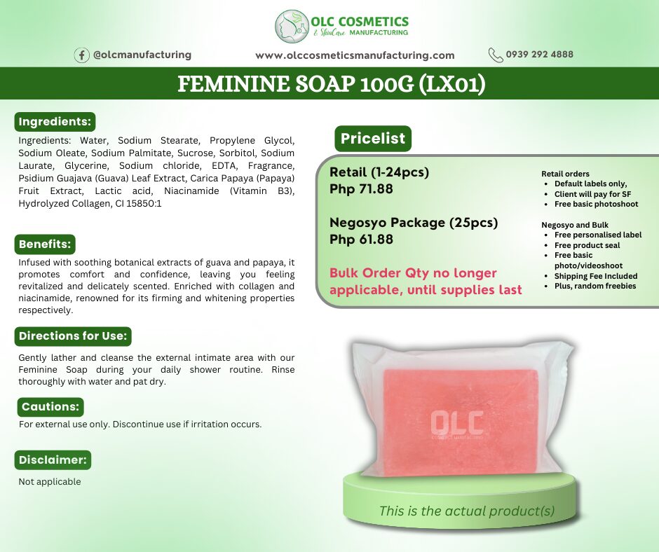 Directions for Use: Gently lather and cleanse the external intimate area with our Feminine Soap during your daily shower routine. Rinse thoroughly with water and pat dry.