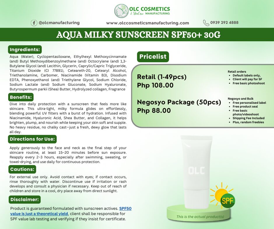 Disclaimer: Product is guaranteed formulated with sunscreen actives. SPF50 value is just a theoretical yield, client shall be responsible for SPF value lab testing and verifying if they insist for certificate
